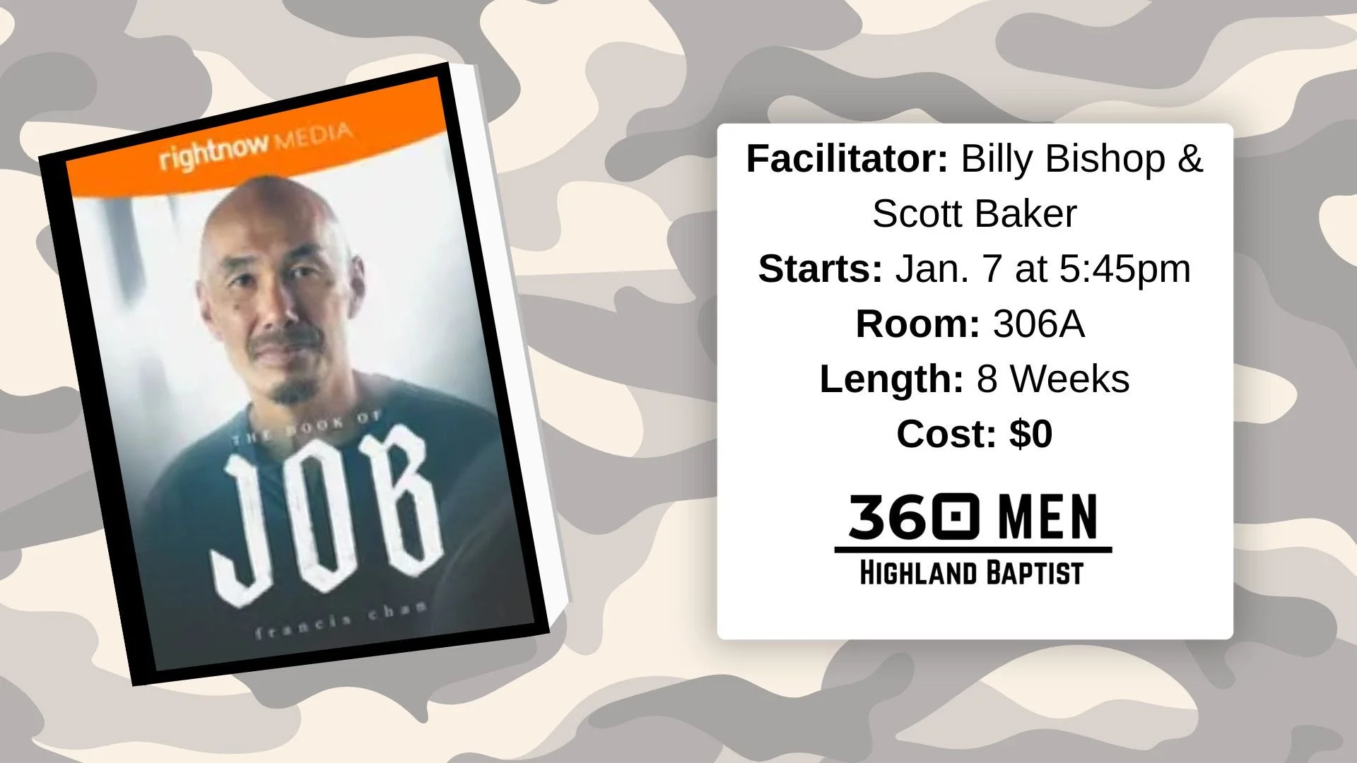 The Book of Job by Francis Chan begins January 7 at 5:45 PM and will be led by Billy Bishop and Scott Baker in room 306A.