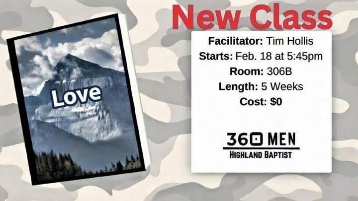 Love: A Man Church Offering will begin February 18 at 5:45 PM and will be led my Tim Hollis in room 306B.
